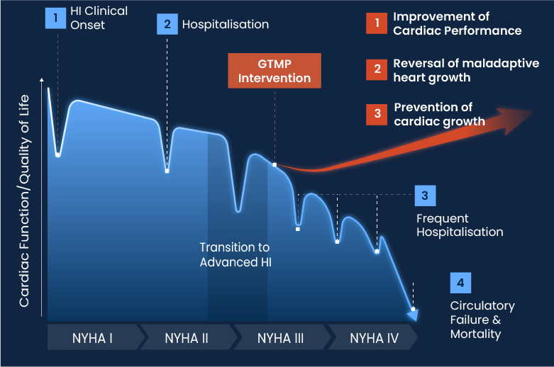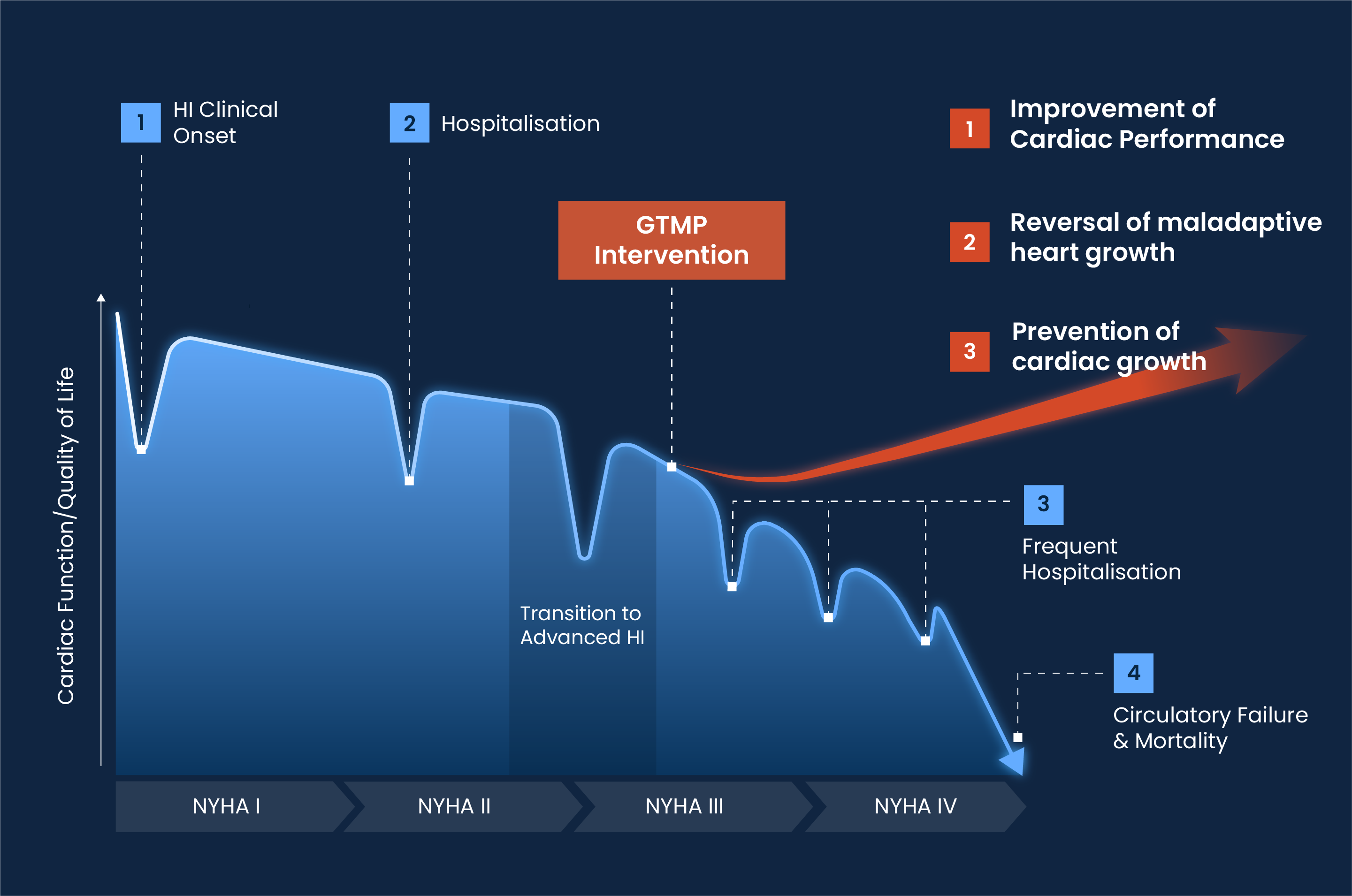 Our tailored gene therapies are poised to revolutionize cardiovascular care through our heart-specific adeno-associated viral vector technology. Our therapeutic target pipeline allows the development of advanced therapies with the ability to specifically reverse molecular dysfunctions responsible for systolic and diastolic dysfunction of the myocardium and adverse remodelling of the diseased heart, thus restoring the normal activity of prognostically relevant molecular networks related to cardioprotection, contractile performance and energy homeostasis to be comprehensively restored.