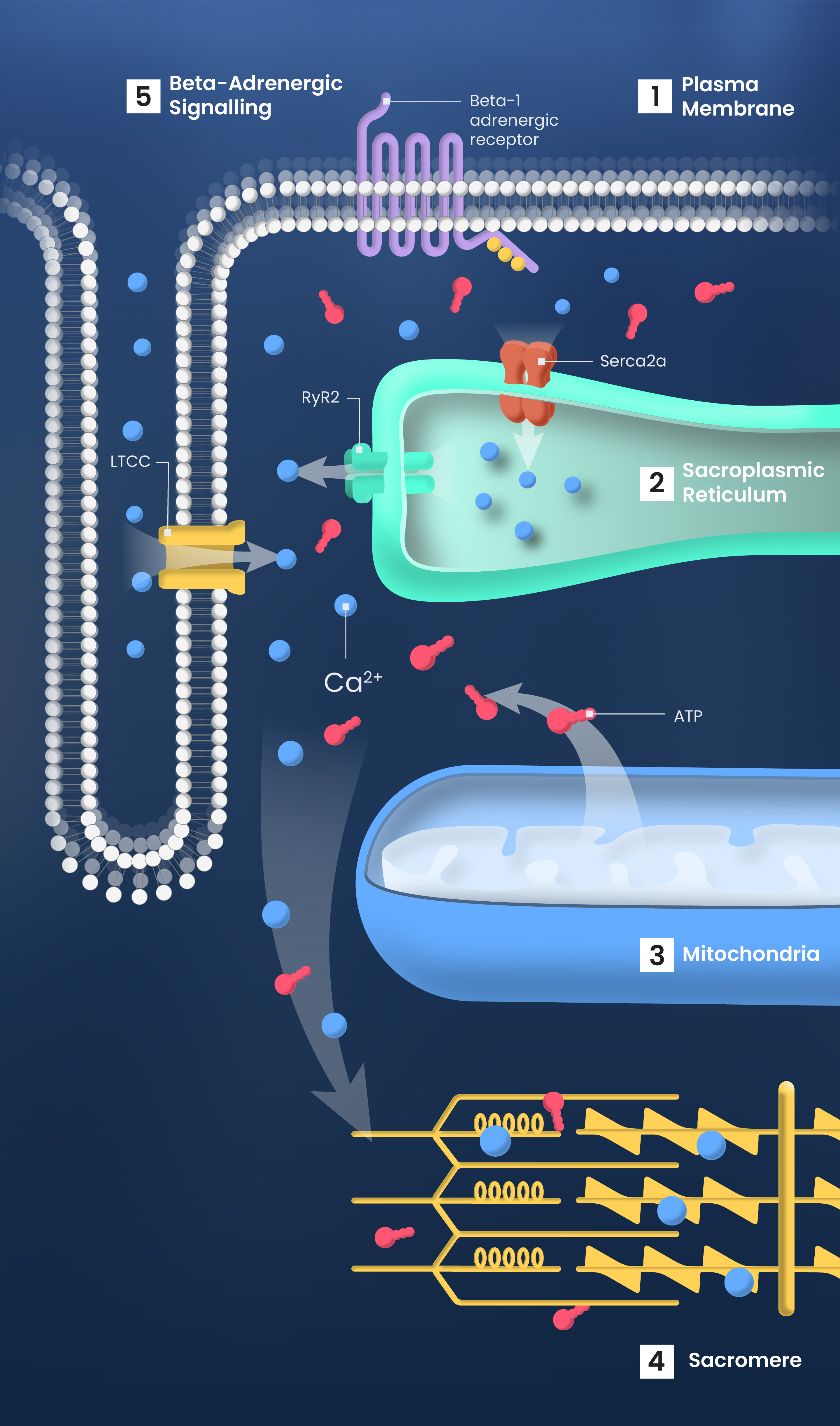 Abnormal neurohormonal stimulation with diminished ß-adrenergic responsiveness is a hallmark of heart failure. Our therapeutic targets can improve dysfunctional voltage-dependent calcium channel activity and trans-sarcolemmal calcium entry, respectively, upon aberrant ß-AR downstream stimulation, thereby, restoring the contractile performance reserve of the diseased heart.